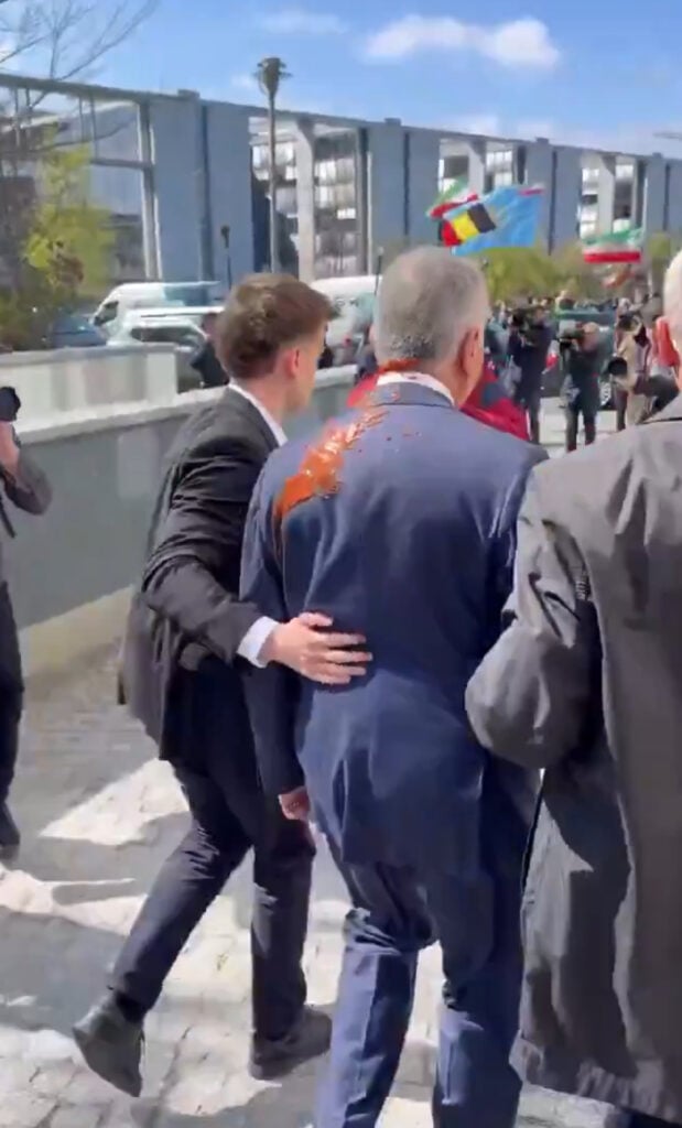 Iran’s exiled Crown Prince Reza Pahlavi was drenched in what appeared to be tomato juice as he left a press briefing in Berlin, in an incident that unfolded outside Germany’s federal press conference building.