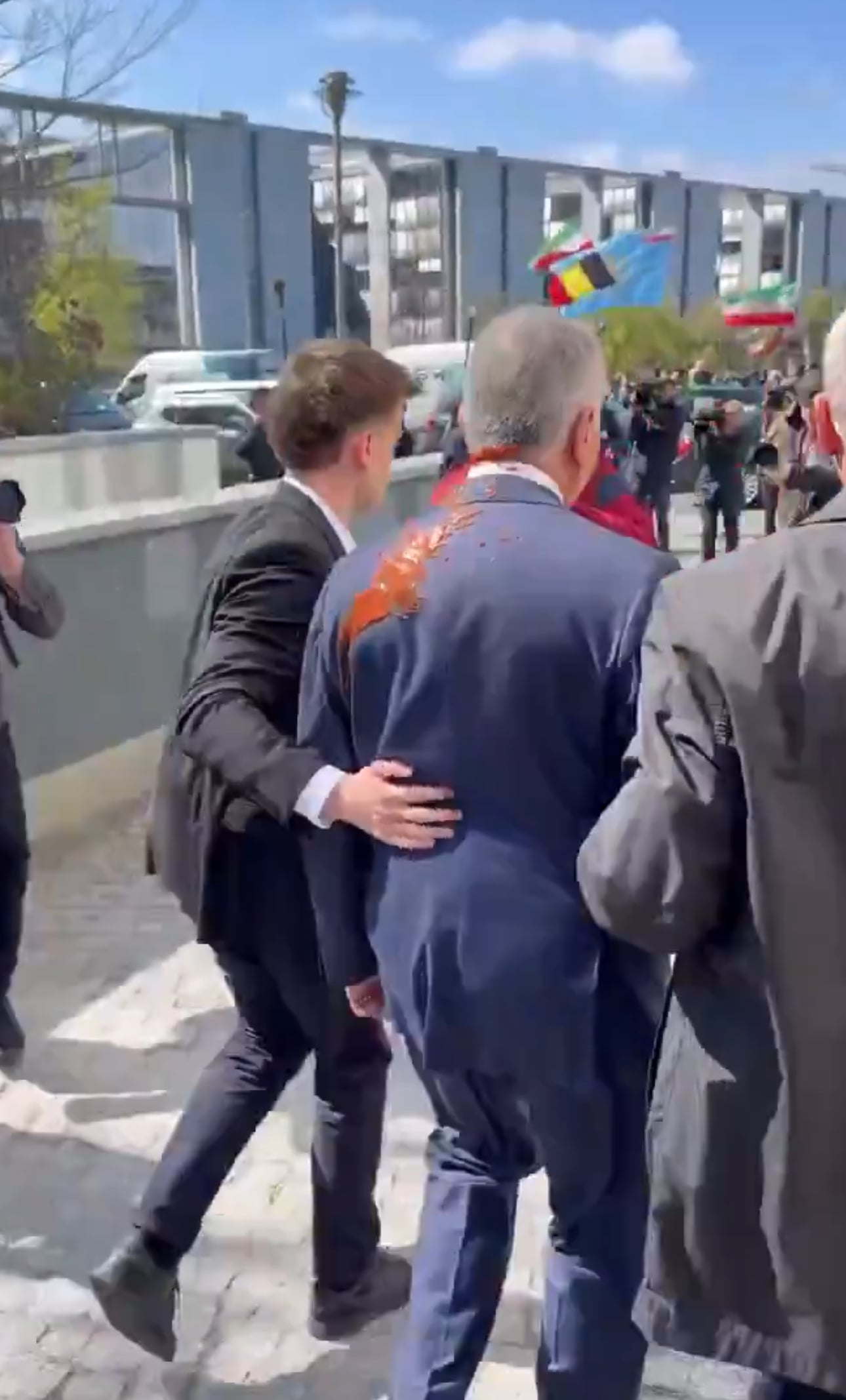 Pahlavi, son of the ousted Shah of Iran, had just finished speaking to journalists — during which he criticised the ceasefire between the United States and Iran — when an individual approached him from behind and threw the red liquid over him as he exited the building. The substance covered the back of his blazer and his neck. Despite the dramatic nature of the incident, he appeared unharmed, pausing to wave to supporters gathered outside before calmly getting into a waiting car and being driven away.
